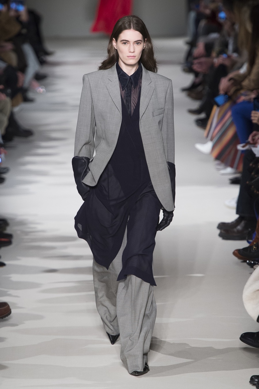 Alexander Wang kadınları oldukça sertti. Bana sorarsanız koleksiyon parçalarındaki keskin kenarlar Wang’ in ana fikrini yansıtıyordu. Punk stilin yeniden yorumlanması gibiydi. Siyah, sert ve oldukça sivri kadınlar yaratmıştı Wang. Tüm koleksiyonu sevdim diyemem (bu benim moda kimliğimle alakalı yanlış anlaşılmasın). Ama aksesuarlara bayıldım. Defilenin en dikkat çeken ve sosyal medyada en çok paylaşılan parçası ise kesinlikle “No After Party” yazılı çoraplar oldu. İnstagram hesabım @modastilde ‘ de paylaştığım görüntünün aldığı like sayısı beni bile şaşırttı açıkçası. Sanırım artık mesaj her yerde ve çok da benimsendi diyebiliriz 🙂