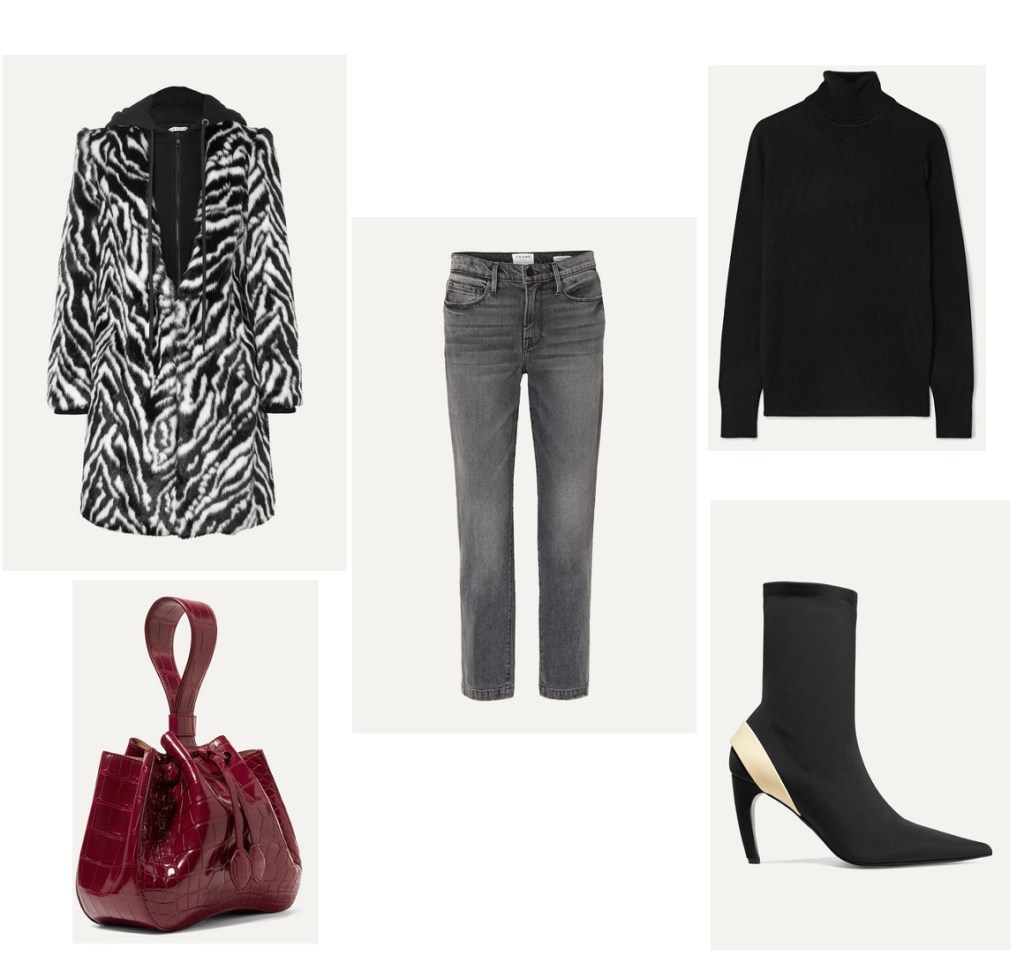 Ekru yada krem rengi suni kürklü bir ceketi hayvan baskılı bir pantolonla bir araya getirin ve sivri burunlu bir çift siyah botla tamalayın.