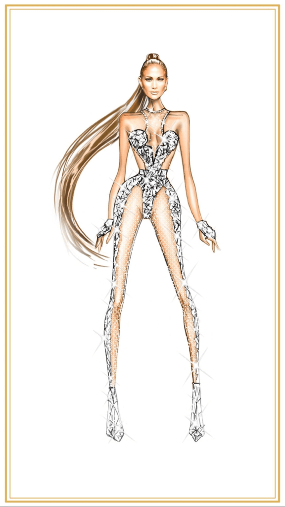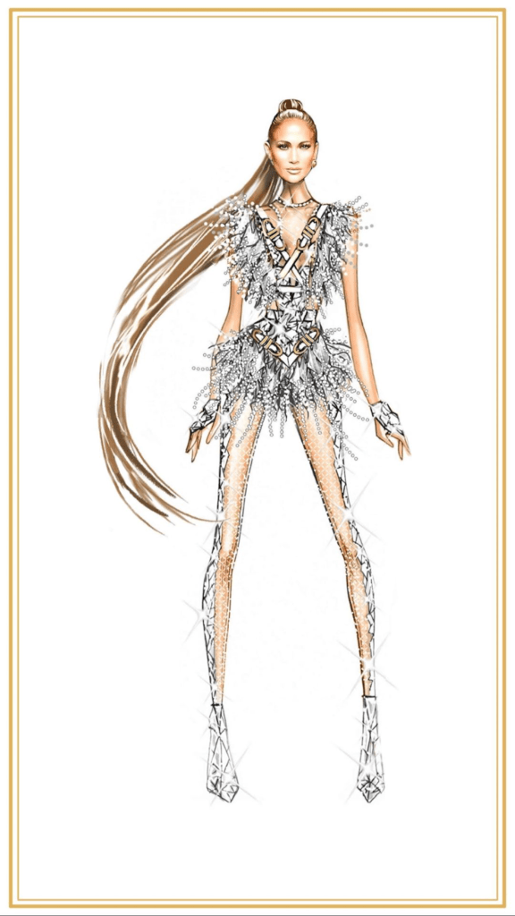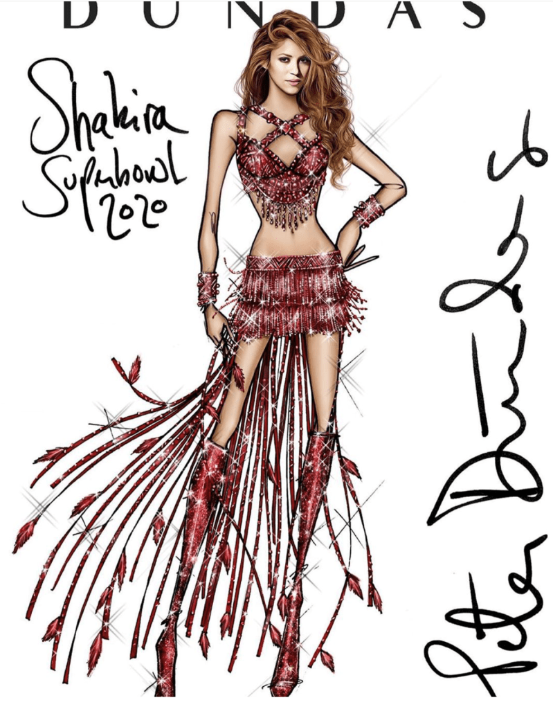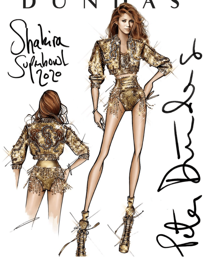 Şov öncesi hazırlanan kostüm sketchleri tabii ki şov sonrası markalar ve tasarımcıları tarafından bir bir paylaşıldı. En iyi görüntüyü kesinlikle JLo yansıtıyor. Üzgünüm fakat Shakira ve sketch görüntüler arasında oldukça büyük farklar var. O dümdüz bot ve sneaker yerine az topuklu ayakkabılar tercih etmeliydi (Bknz. JLo).
