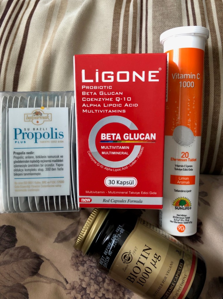 6- Bağışıklığınızı destekleyecek vitaminler alın. C vitamini çok önemli, beta glukanlar, D vitamini ve kara mürver almaya özen gösterin. Aktardan kara mürver alın ve sıcak bir fincan suya bir tatlı kaşığı koyup demleyerek günde 3 defa için 😉 Ben oğluma kara mürver içeren bir vitamin şurubu aldım. Çocuklara bu şekilde içirmek daha kolay olabiliyor.