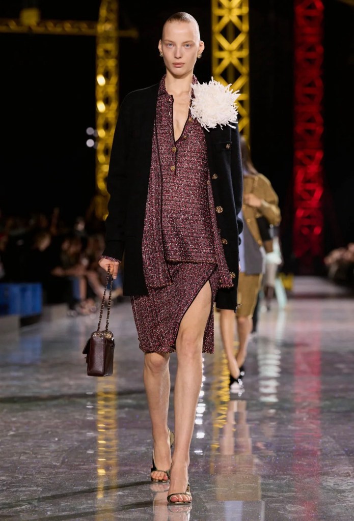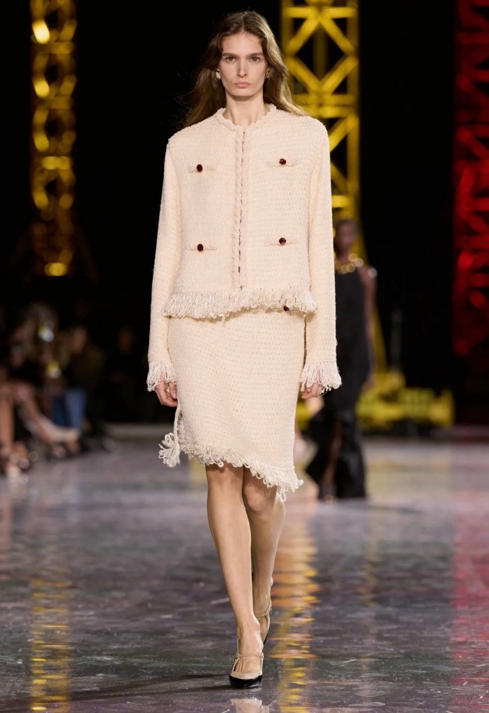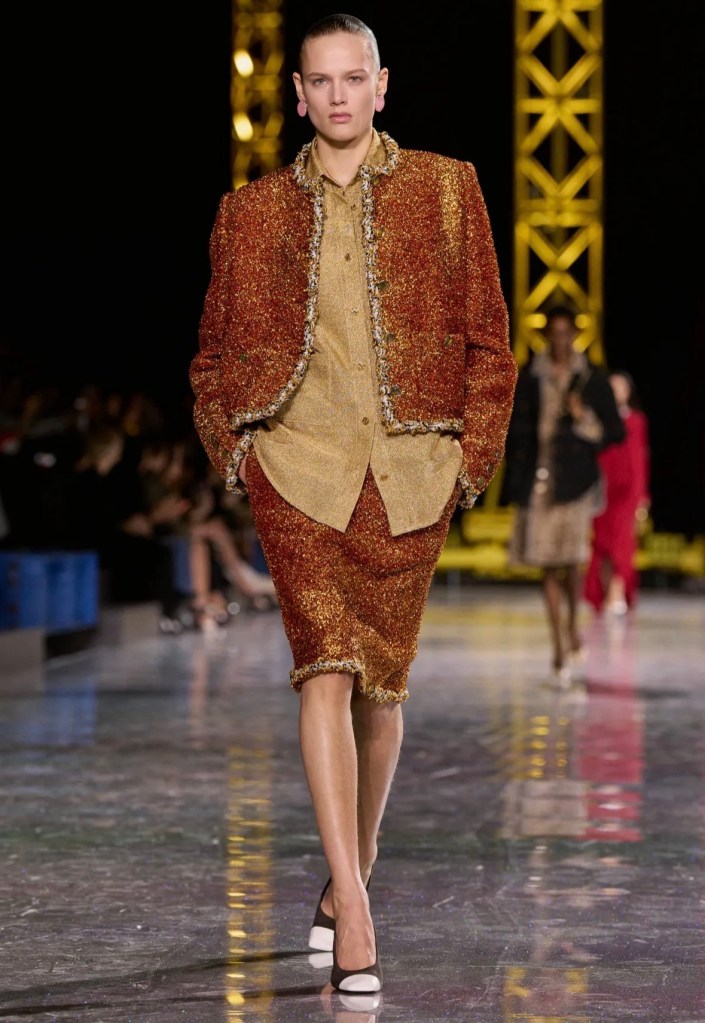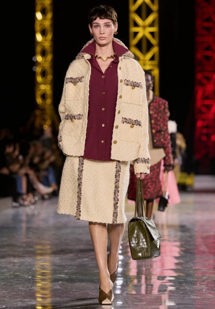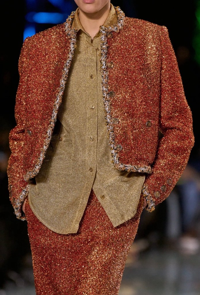- Gevşetilmiş Tweed: O bildiğimiz klasik, kuralcı Chanel ceketleri gitmiş; yerine fitilli trikolarla desteklenen, altın düğmeler yerine ara ara fermuarların kullanıldığı ve lureks iplerle boyut kazanan çok daha rahat “bluzon” ceketler ve iş gömlekleri gelmiş.