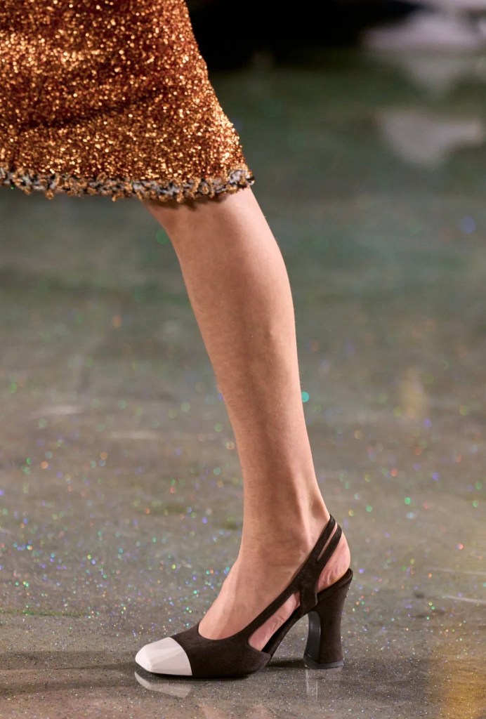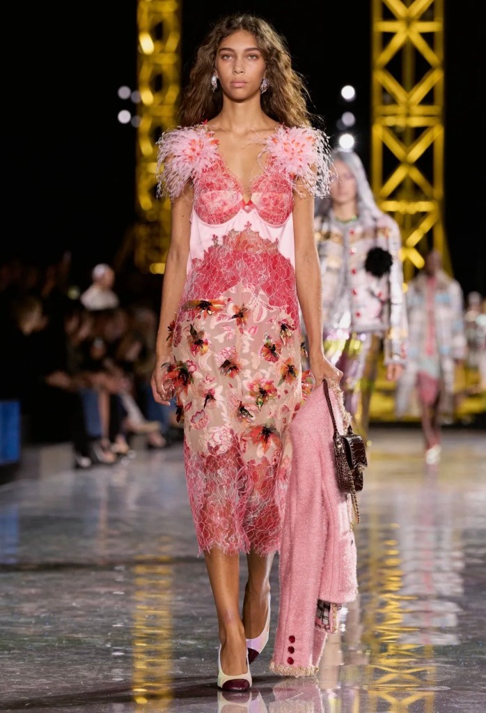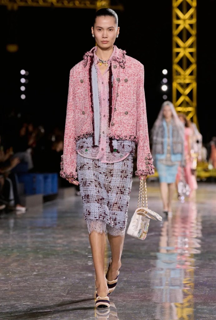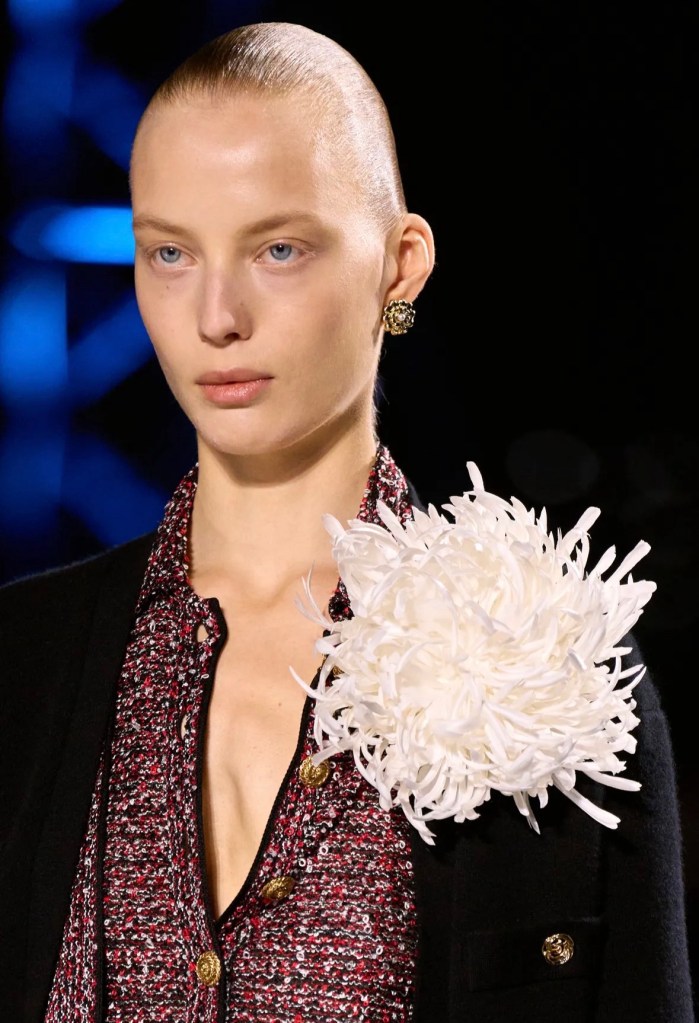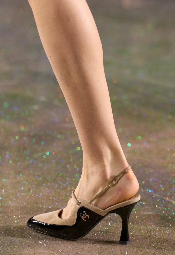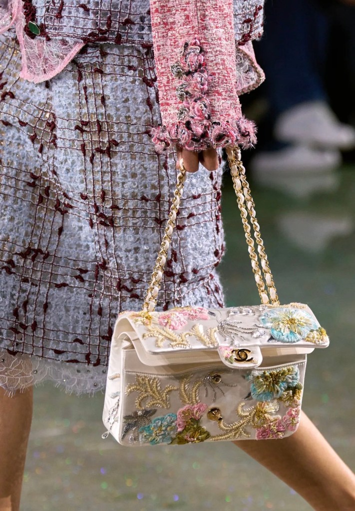 Mücevher ve Ayakkabılar: Renkli güneş gözlükleri, kalın reçine takılar ve pastel tonlarda, adeta ikinci bir ten gibi duran botlar eşliğinde; dokulu çiçeklerle süslenmiş klasik burunlu Chanel ayakkabılar podyumun yıldızları arasındaydı.