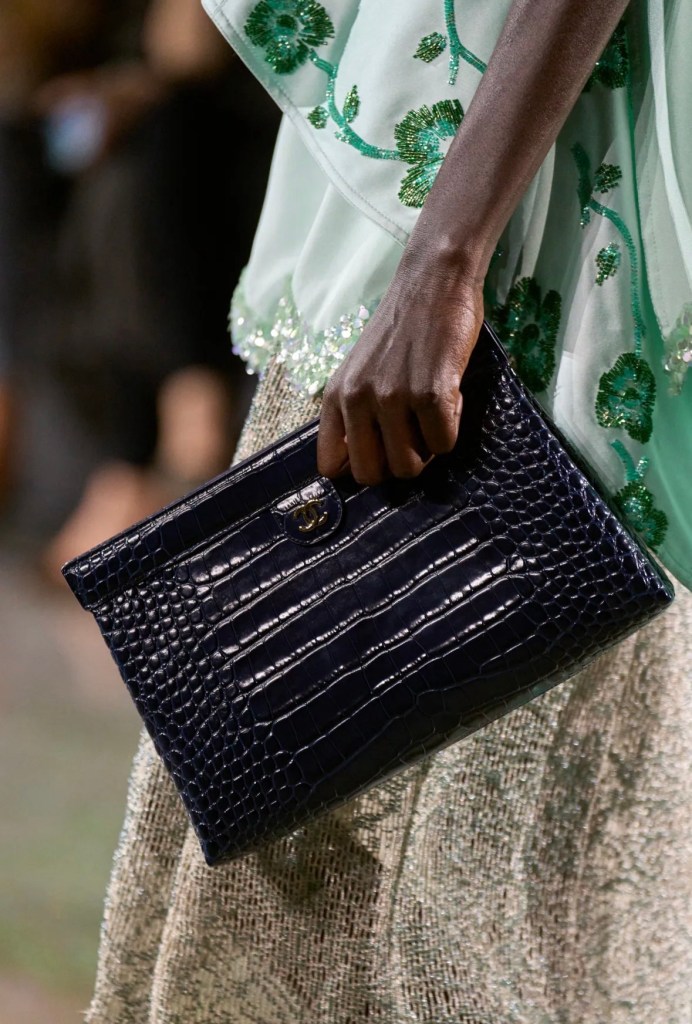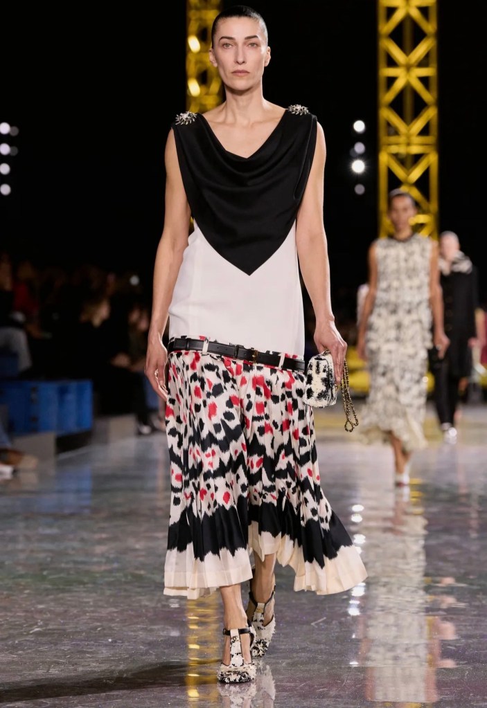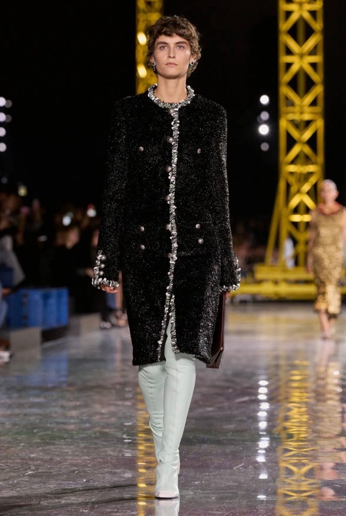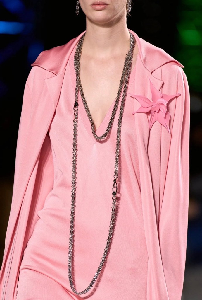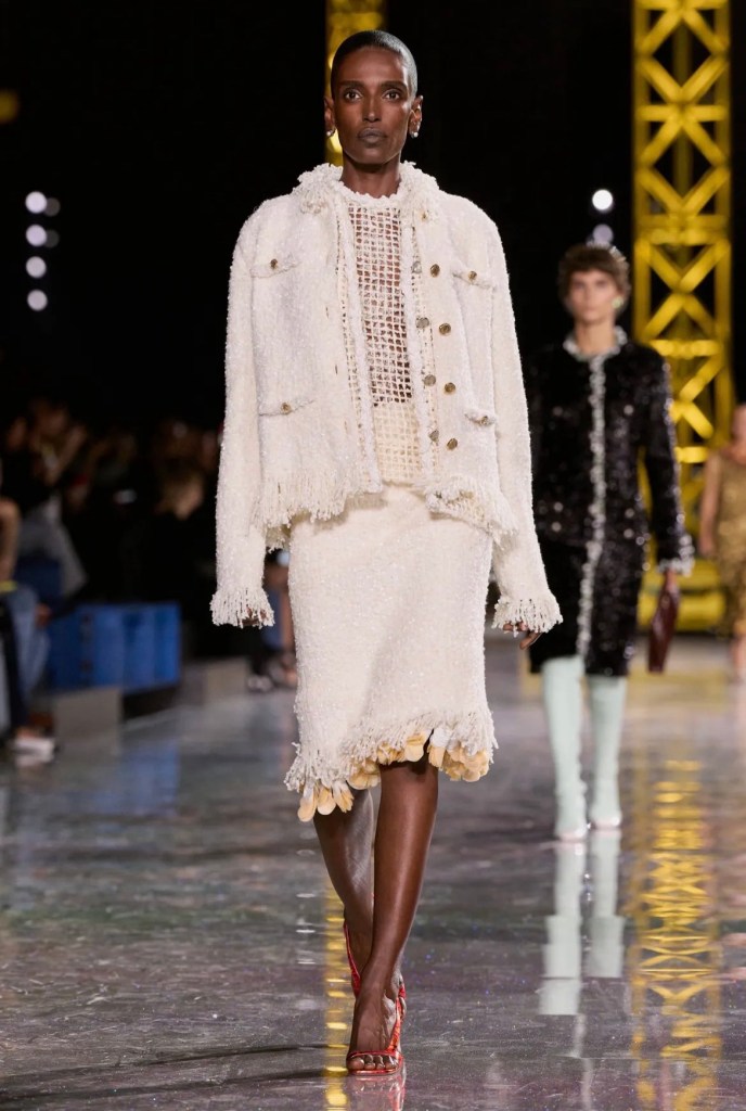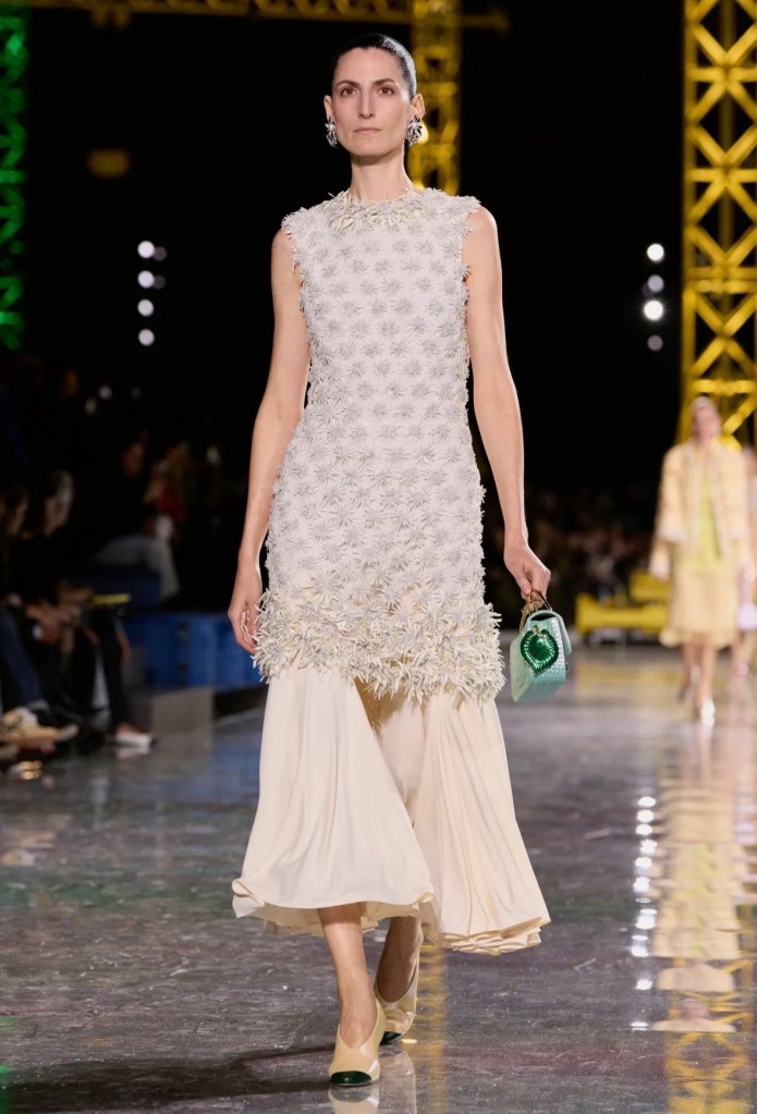 Mücevher ve Ayakkabılar: Renkli güneş gözlükleri, kalın reçine takılar ve pastel tonlarda, adeta ikinci bir ten gibi duran botlar eşliğinde; dokulu çiçeklerle süslenmiş klasik burunlu Chanel ayakkabılar podyumun yıldızları arasındaydı.