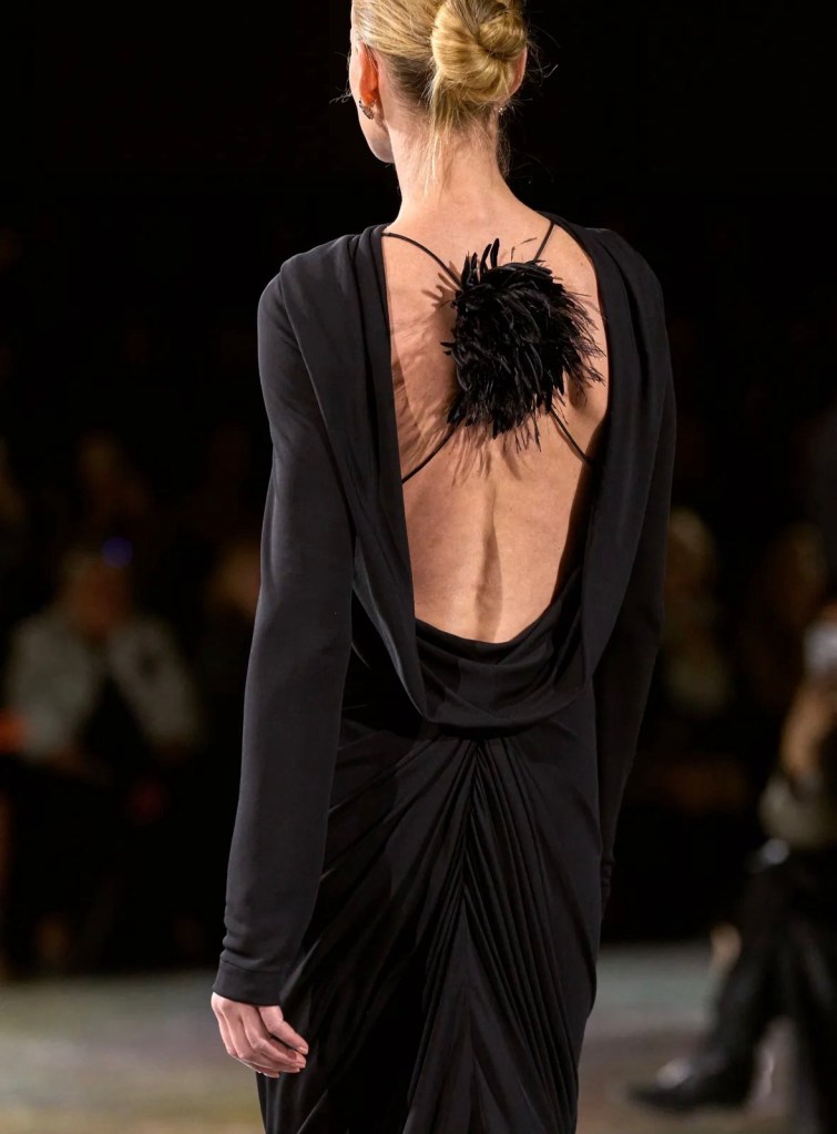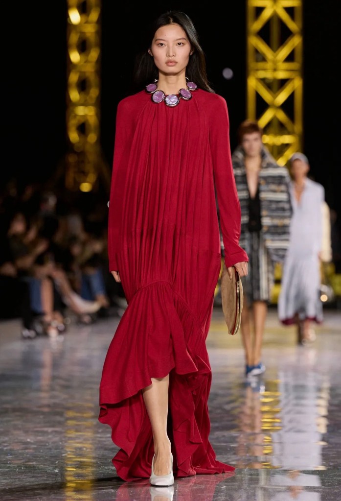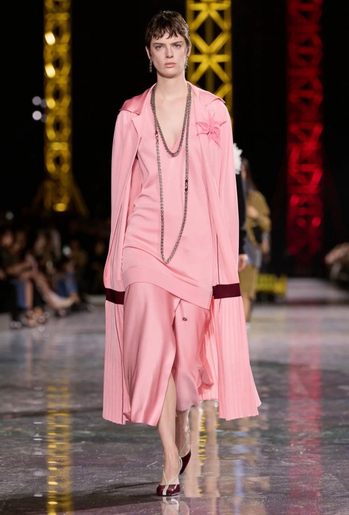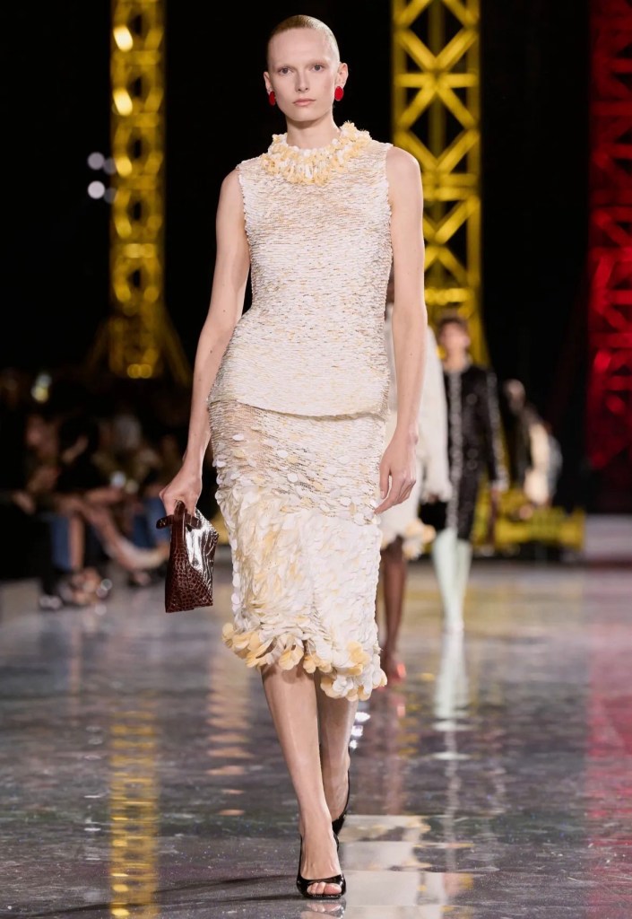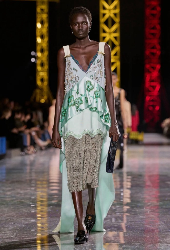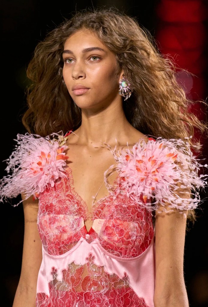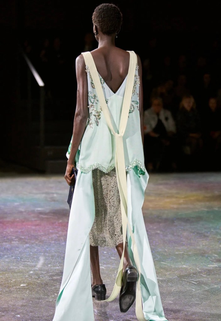 - Gece Kelebekleri: Şovun sonlarına doğru o pırıltılı “uçan” elbiseleri gördük. Balık pulu gibi parlayan payetli elbiseler, yıldız hatıralarını andıran işlemeli paltolar, bedeni saran uçuş uçuş ipek jarseler ve göğüsten fışkıran devasa kumaş çiçekler… Modellerin pastel tonlara boyanmış saçları da bu sürreal, gece kelebeği temasını kusursuzca destekledi.
