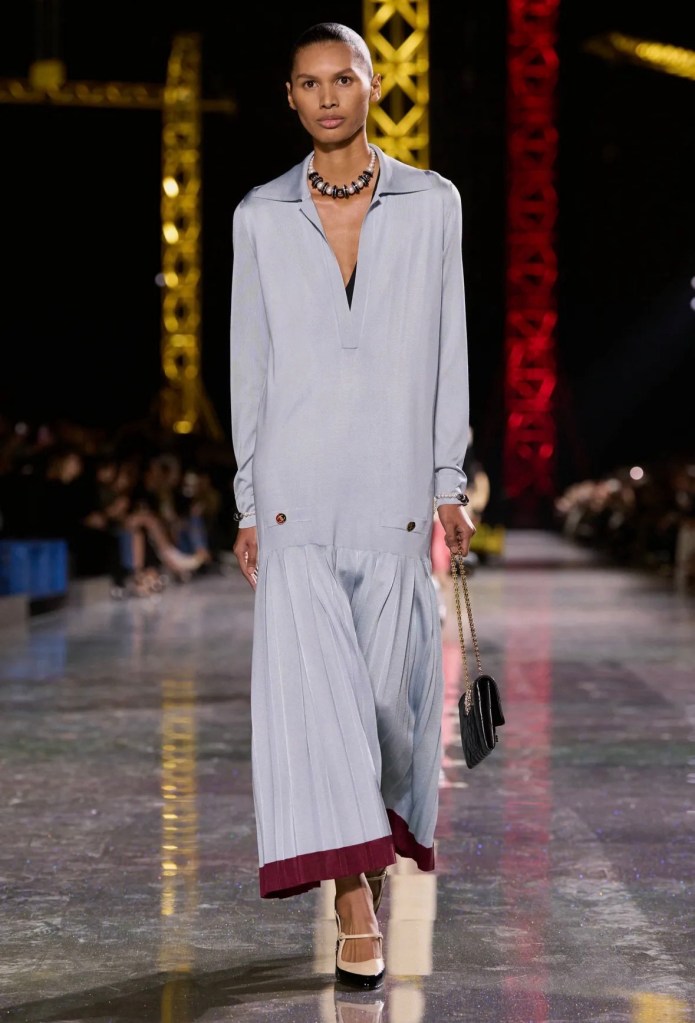 Blazy, bu sezon ilhamını doğrudan Gabrielle “Coco” Chanel’in şu çarpıcı sözünden almış: “Moda hem tırtıl hem de kelebek olmaktır. Gündüzleri bir tırtıl, geceleri ise bir kelebek olun. Emekleyen elbiselere ve uçan elbiselere ihtiyacımız var.” Bu felsefe, koleksiyonun tam kalbine yerleşmiş durumda. Blazy, podyumu adeta inşası devam eden bir şantiye alanına çevirerek (evet, podyumda devasa, parlak ana renklerde vinçler vardı!) Chanel’in kodlarını önce en temel parçalarına ayırdı, sonra onları yepyeni, özgür ve rüya gibi bir forma dönüştürdü.