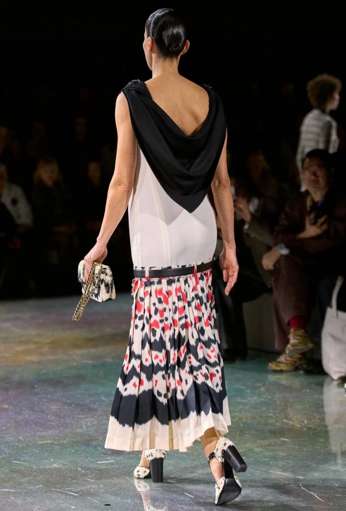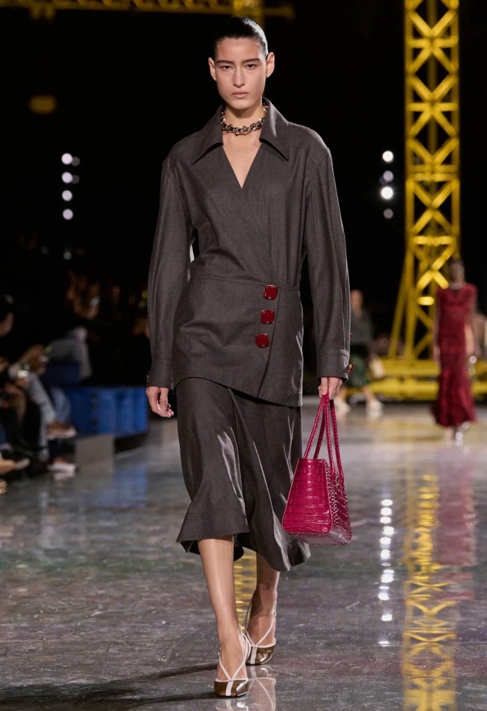 - 1920’lere Modern Bir Selam: Koleksiyonun en cesur hamlesi kesinlikle bel çizgisini radikal bir şekilde aşağı çekmesiydi. Kemerler neredeyse uyluk ortasına kadar düşürülmüş, pilili etekler ceketlerin bittiği yerden başlayarak silüeti tamamen uzatmıştı. Modern bir flapper kızı düşünün, ama 2026 sokaklarında!