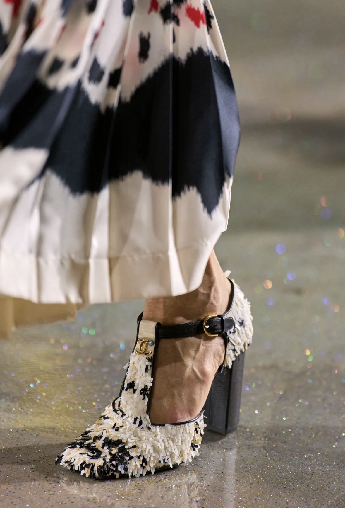 Mücevher ve Ayakkabılar: Renkli güneş gözlükleri, kalın reçine takılar ve pastel tonlarda, adeta ikinci bir ten gibi duran botlar eşliğinde; dokulu çiçeklerle süslenmiş klasik burunlu Chanel ayakkabılar podyumun yıldızları arasındaydı.