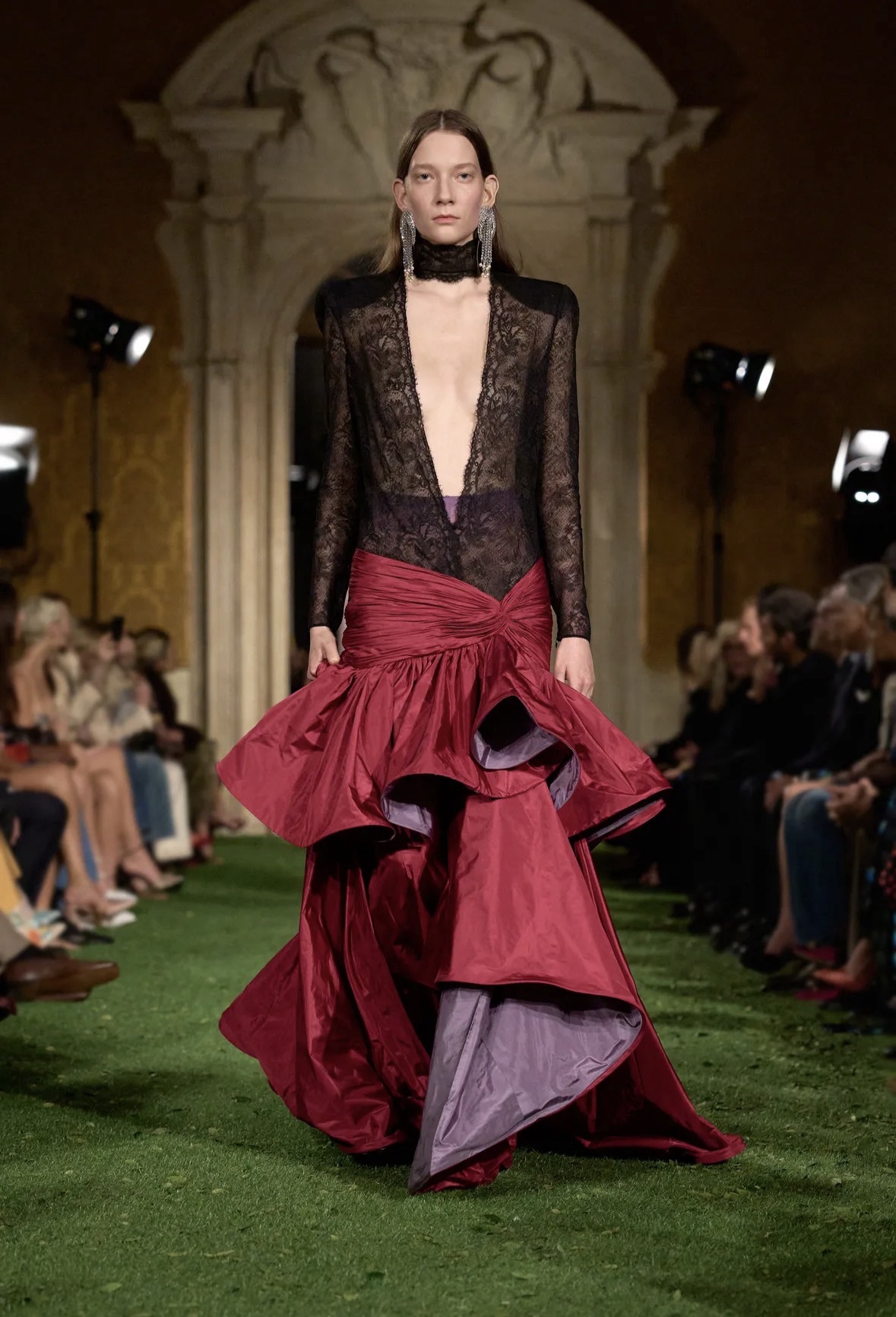 - Silüetler ve Dokular: 1980’lerin görkemi, modern ve asi dokunuşlarla yeniden yorumlanmıştı. Şeffaf dantel pantolonların keskin hatlı, özel dikim ceketlerle kombinlenmesi veya maskülen çizgilerin şifon detaylarla buluşması, koleksiyonun temelindeki “zıtlık” temasını vurguluyordu.